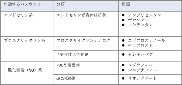 肺高血圧症には薬物治療と非薬物治療があります。薬物治療には以下のようなものがあります。