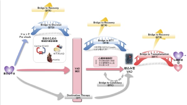 当院はショック状態の心不全患者さんに対しては、本邦で使用可能なすべての一時的補助循環装置が使用可能です。また、心臓移植実施施設であるためBTTでのLVAD植え込み、心臓移植治療が実施可能です。